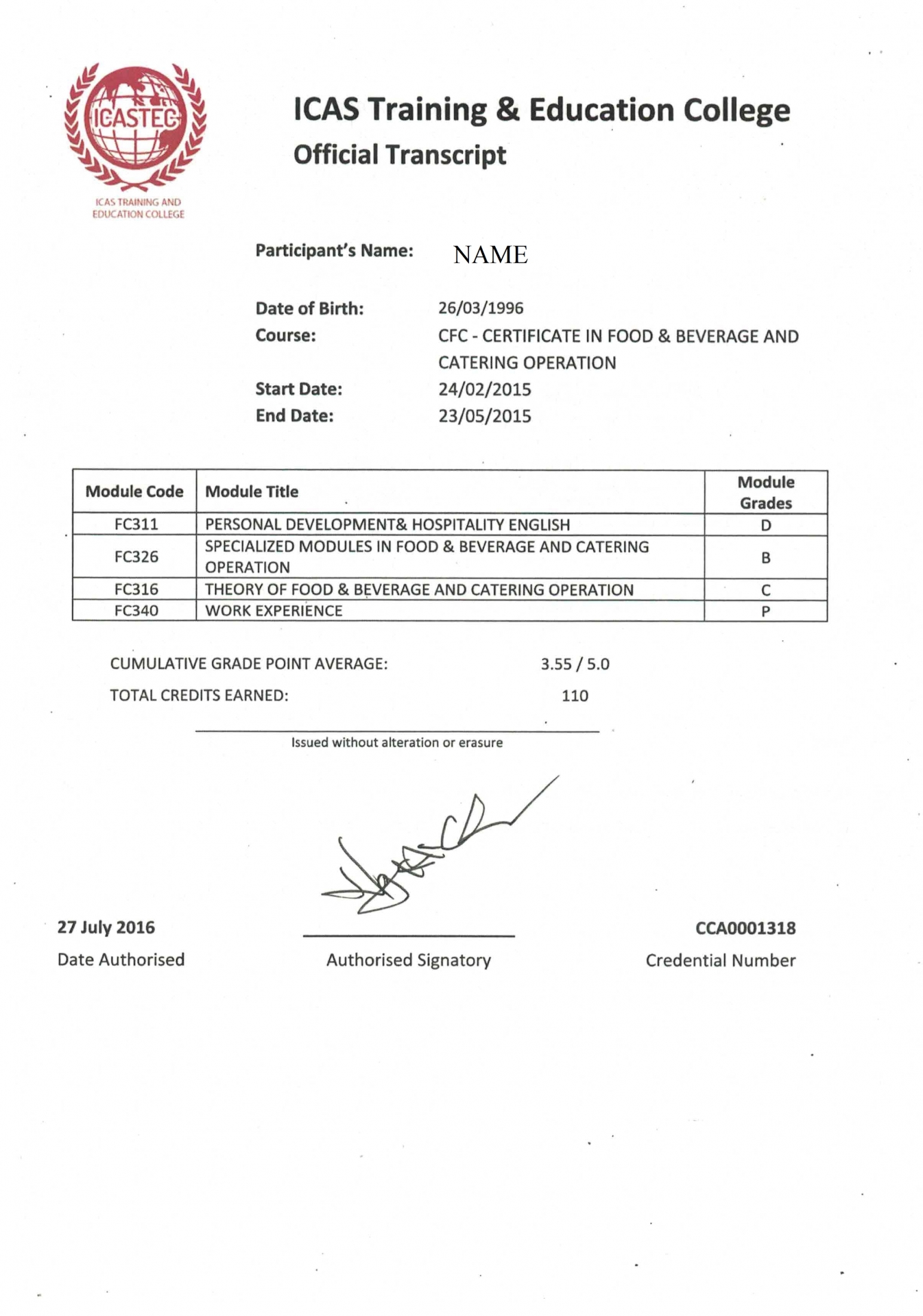 1. Chứng chỉ chuyên nghành nhà hàng và dịch vụ ăn uống (F&B)
